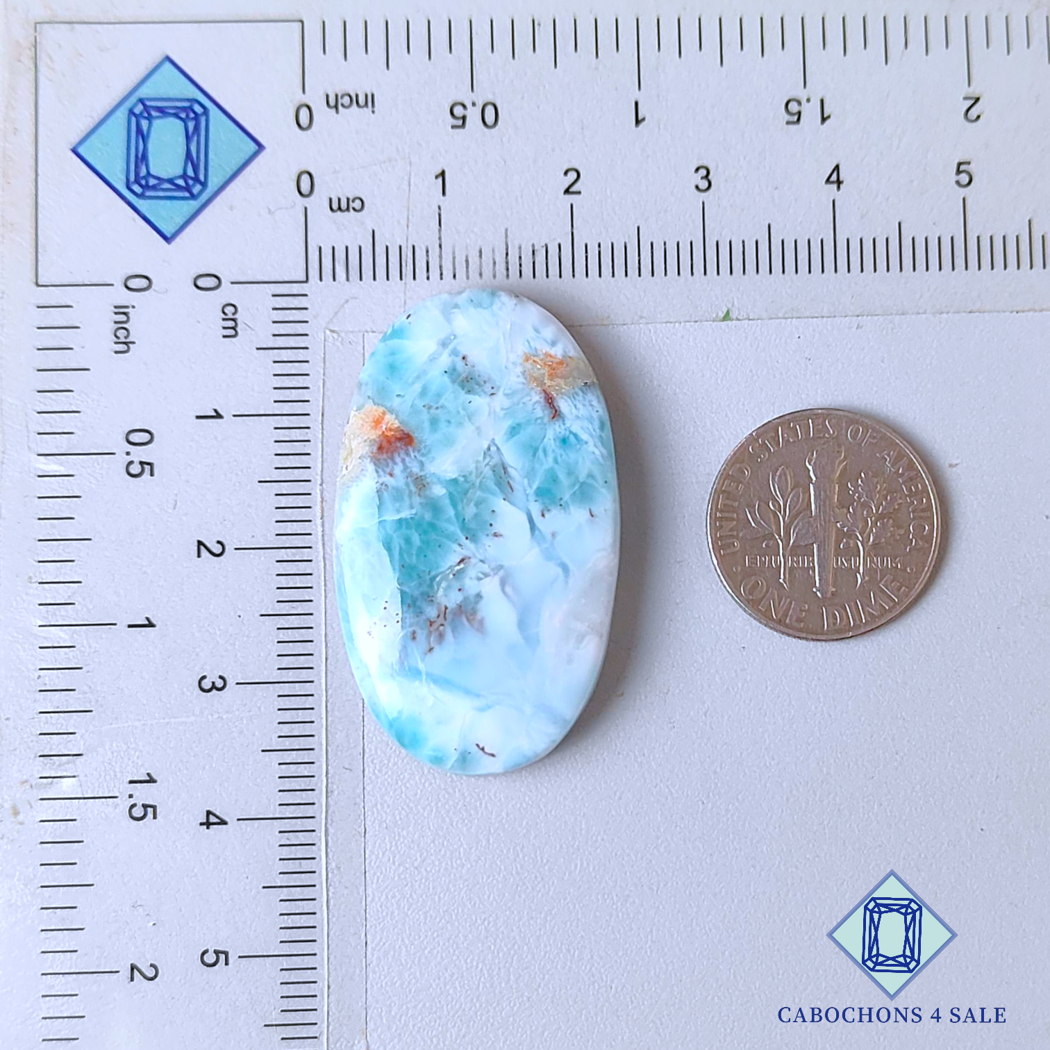 Deslice las imágenes para ver la piedra con la tabla de dimensiones. Esta es una gema de larimar rojo. El producto es natural, ovalado y opaco. La gema de larimar rojo es azul y mide 36 x 21 x 6 mm. La claridad de esta pieza es opaca. El producto está disponible exactamente como se muestra en la imagen: 1 pieza de cabujones ovalados de larimar rojo certificados por el precio indicado anteriormente.
