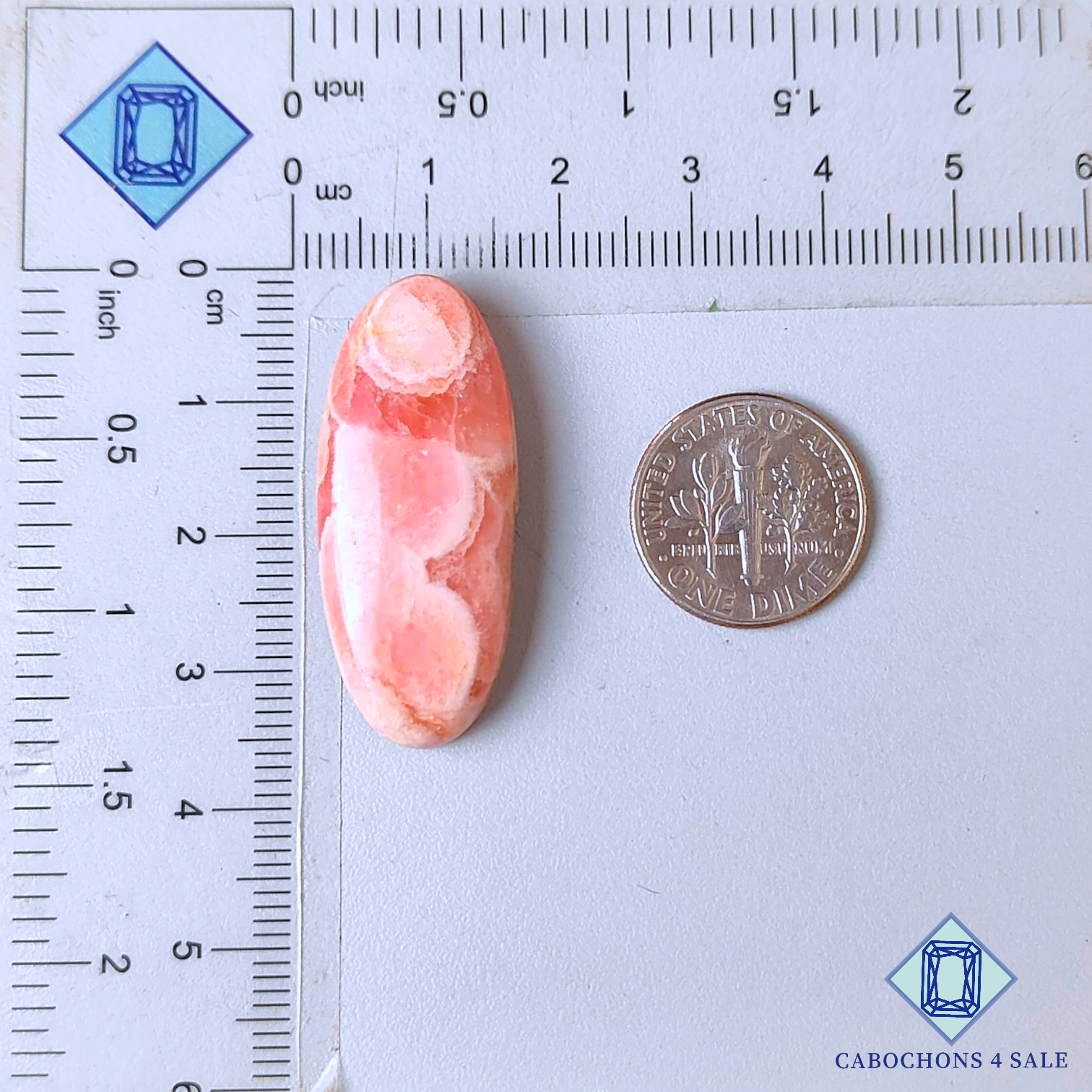 Deslice las imágenes para ver la piedra con la tabla de dimensiones. Esta es una gema de rodocrosita. El producto es natural, ovalado y translúcido. La rodocrosita es de color rosa y mide 34 x 15 x 7 mm. La claridad de esta pieza de rodocrosita es translúcida. El producto está disponible exactamente como se muestra en la imagen: 1 pieza de cabujones ovalados de rodocrosita certificados por el precio indicado anteriormente.