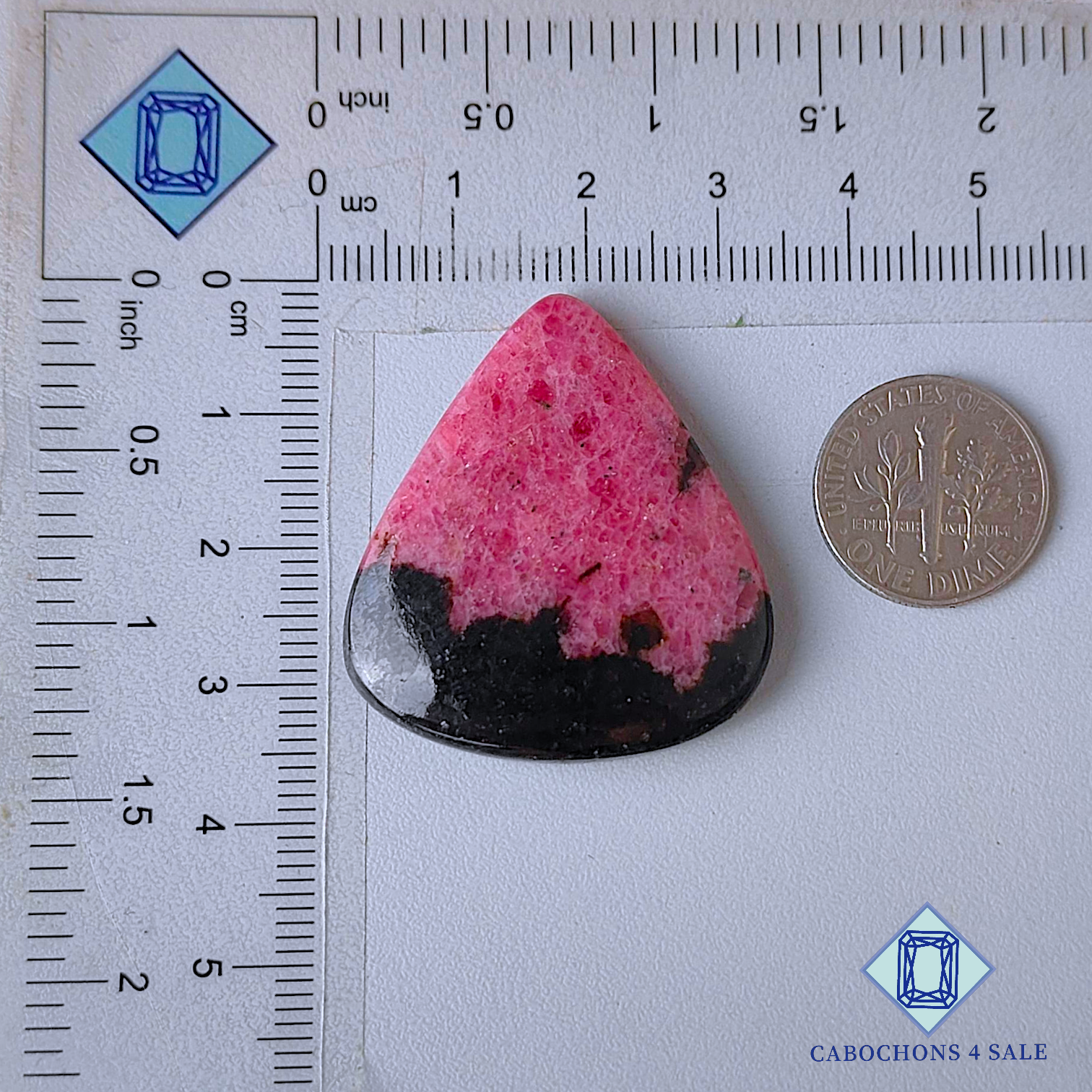 Deslice las imágenes para ver la piedra con la tabla de dimensiones. Esta es una gema de rodonita. El producto es natural, de forma pera y opaco. La rodonita es de color rosa y mide 34 x 31 x 6 mm. La claridad de esta pieza de rodonita es opaca. El producto está disponible exactamente como se muestra en la imagen: 1 pieza de cabujones de rodonita de forma pera certificados por el precio indicado anteriormente.