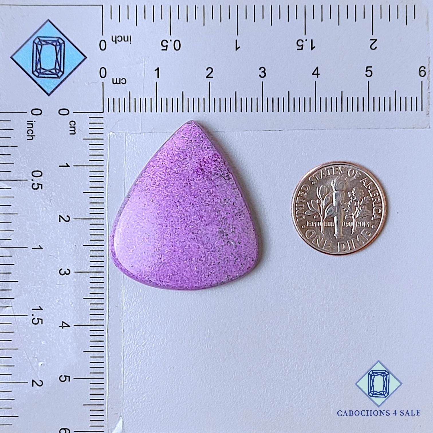 Deslice las imágenes para ver la piedra con la tabla de dimensiones. Esta es una gema de estichtita. El producto es natural, de forma pera y opaco. Es de color púrpura y mide 32 x 28 x 5 mm. La claridad de esta pieza es opaca. El producto está disponible exactamente como se muestra en la imagen: 1 pieza de cabujones de estichtita de forma pera certificados por el precio indicado anteriormente.