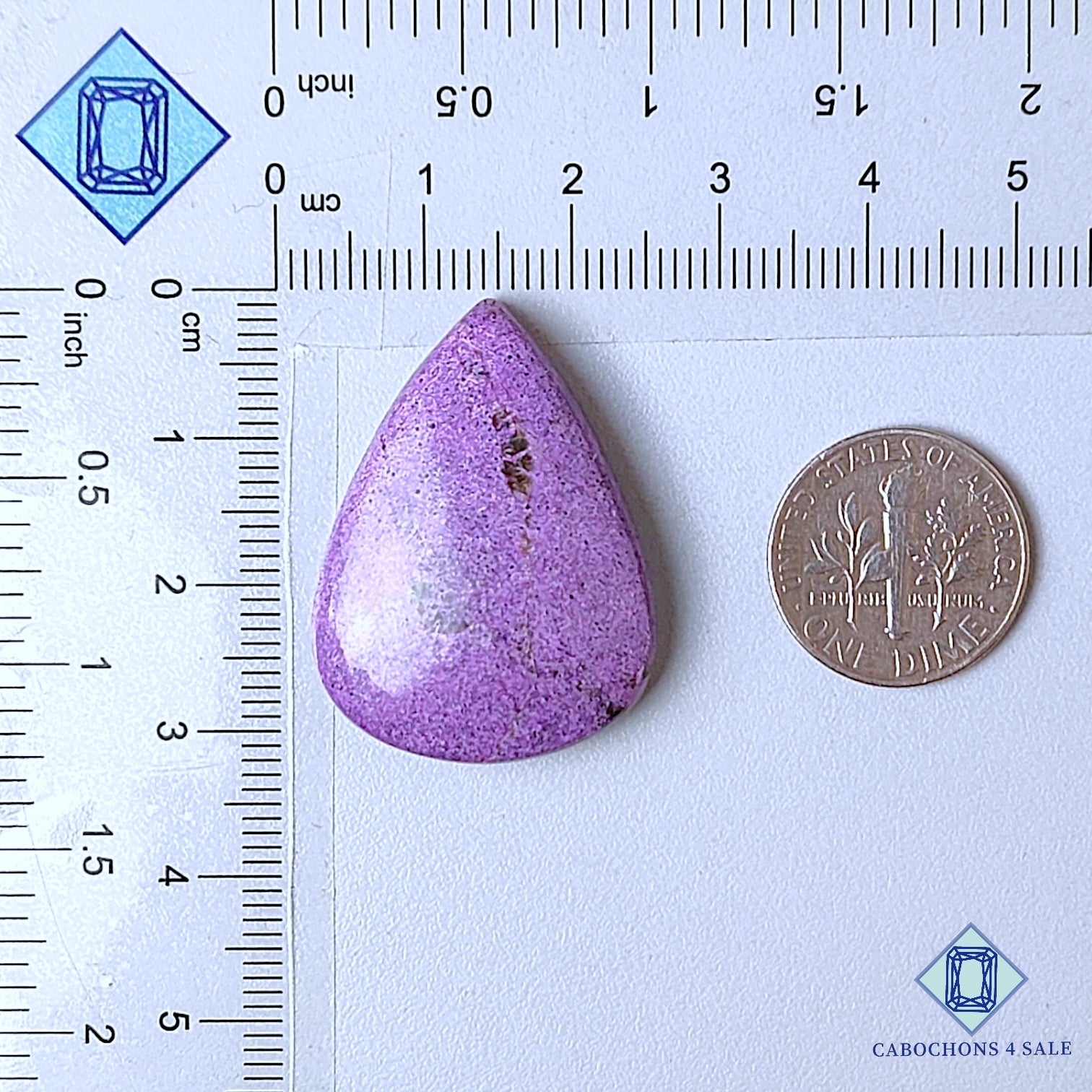Deslice las imágenes para ver la piedra con la tabla de dimensiones. Esta es una gema de estichtita. El producto es natural, de forma pera y opaco. Es de color púrpura y mide 31 x 23 x 7 mm. La claridad de esta pieza es opaca. El producto está disponible exactamente como se muestra en la imagen: 1 pieza de cabujones de estichtita de forma pera con certificación al precio indicado anteriormente.