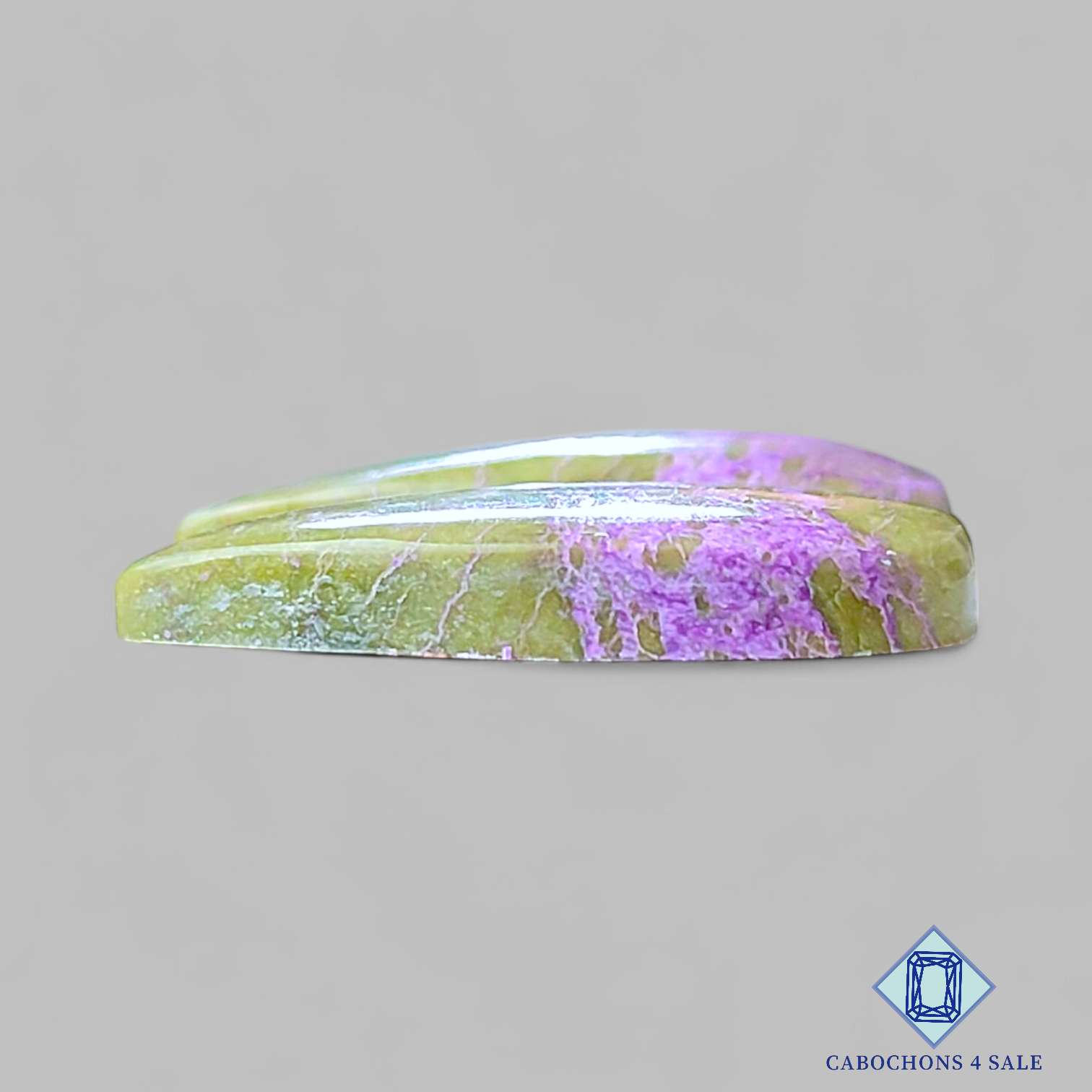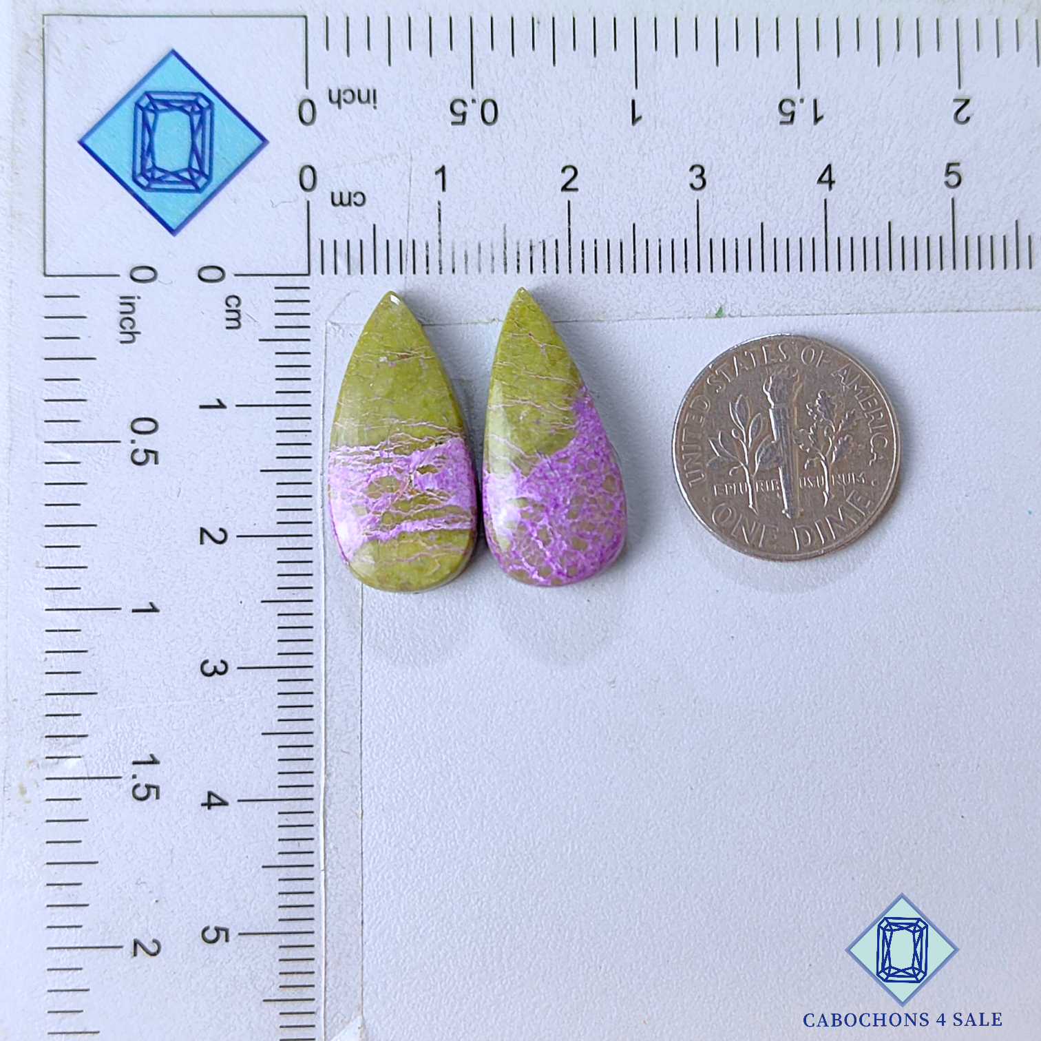 Deslice las imágenes para ver la piedra con la tabla de dimensiones. Esta es una gema de estichtita. El producto es natural, de forma pera y opaco. Es de color púrpura y mide 23 x 11 x 4 mm. La claridad de esta pieza es opaca. El producto está disponible exactamente como se muestra en la imagen: 1 par de estichtitas de forma pera certificadas por el precio indicado anteriormente.