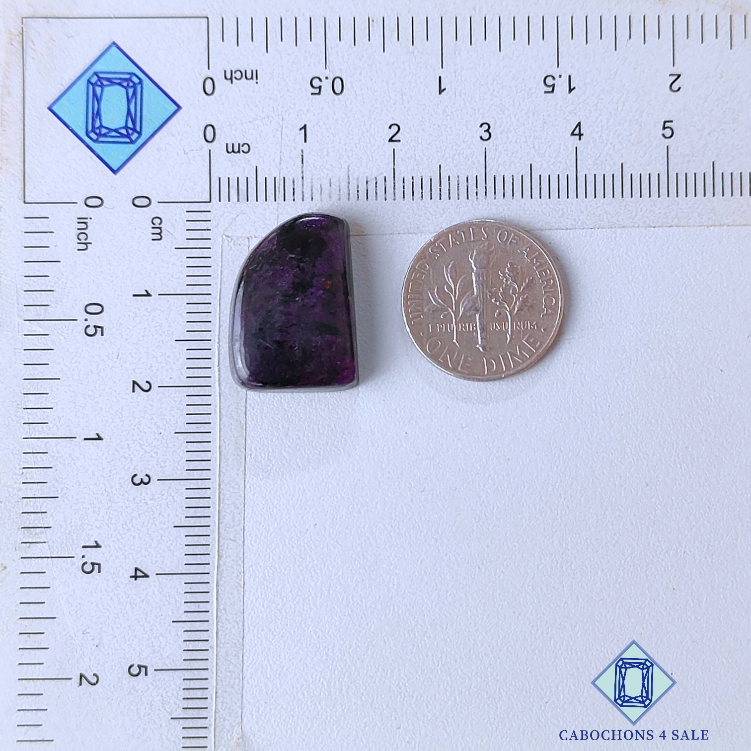 Deslice las imágenes para ver la piedra con la tabla de dimensiones. Esta es una gema de sugilita. El producto es natural, de fantasía y opaco. La gema de sugilita es de color púrpura y mide 19 x 14 x 5 mm. La claridad de esta pieza de sugilita es opaca. El producto está disponible exactamente como se muestra en la imagen: 1 pieza de cabujones de fantasía de sugilita certificados por el precio indicado anteriormente.