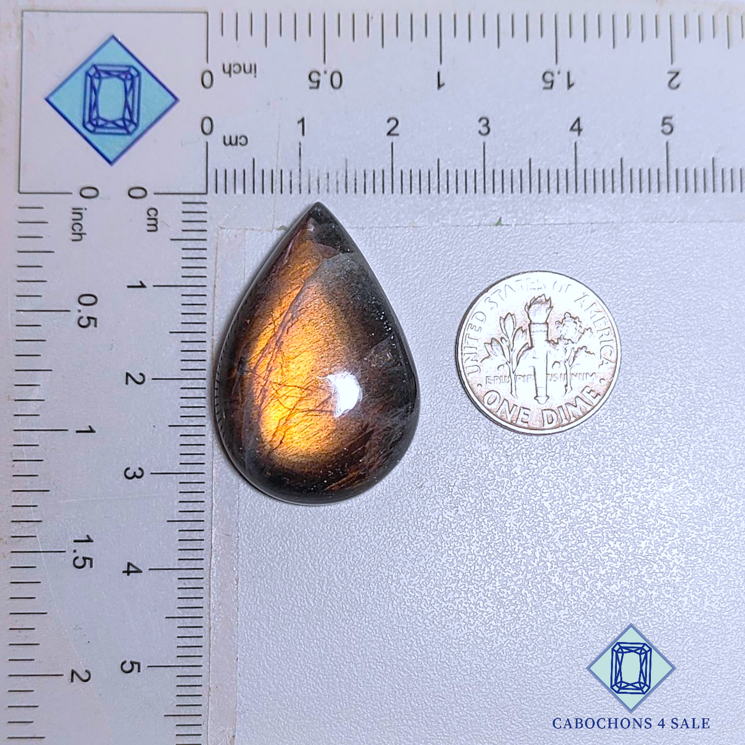 Deslice las imágenes para ver la piedra con la tabla de dimensiones. Esta es una labradorita amarilla. El producto es natural, de forma pera y translúcida. La labradorita amarilla es de color amarillo y mide 32 x 21 x 9 mm. La claridad de esta labradorita amarilla es translúcida. El producto está disponible exactamente como se muestra en la imagen: 1 cabujón de labradorita amarilla certificado por el precio indicado anteriormente.