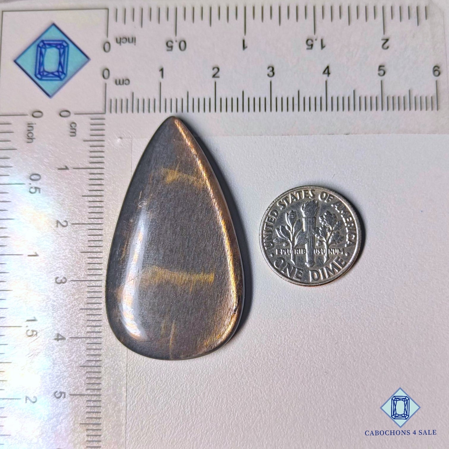Swipe images to see stone with Dimension chart. This is a Black Tanzanian Sunstone gemstone. The Product is a natural , Pear, Translucent. Black Tanzanian Sunstone gemstone in Black color with the  size of 42*24*4mm. Clarity of this Black Tanzanian Sunstone Piece is  Translucent. The Product is available exactly same shown in the picture: 1 piece Pear Cabochons Black Tanzanian Sunstone certified for the price listed above.