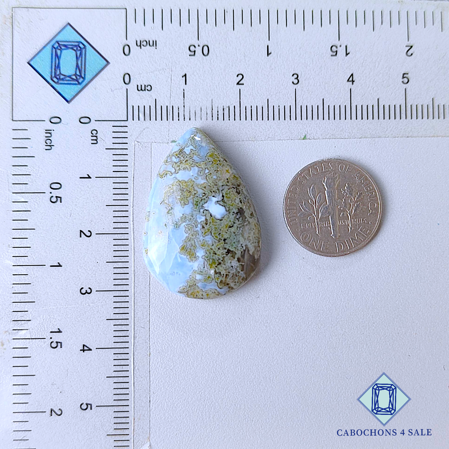 Swipe images to see stone with Dimension chart. This is a Blue Moss Agate gemstone. The Product is a natural , Pear, Opaque. Blue Moss Agate gemstone in Blue color with the  size of 30*20*6mm. Clarity of this Blue Moss Agate Piece is  Opaque. The Product is available exactly same shown in the picture: 1 piece Pear Cabochons Blue Moss Agate certified for the price listed above.