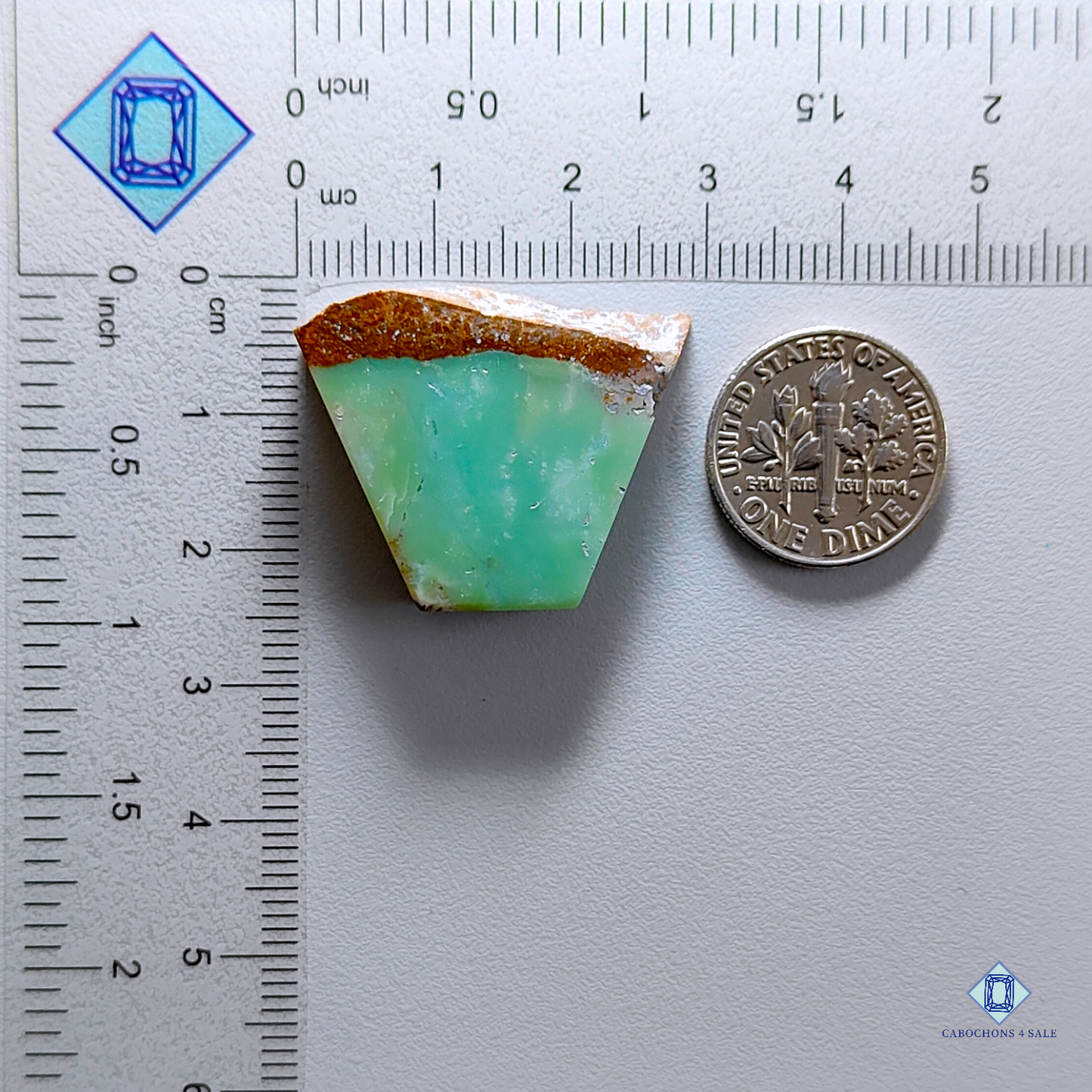 This is a chrysoprase The product is a natural Fancy Slice chrysoprase in blue colour with the approx size of 20 to 25mm Clarity of This chrysoprase Piece is Opaque This gemstone is well cut and polished by our team. The Product is sold as pictured: 1pc Fancy blue chrysoprase for the Price Listed.