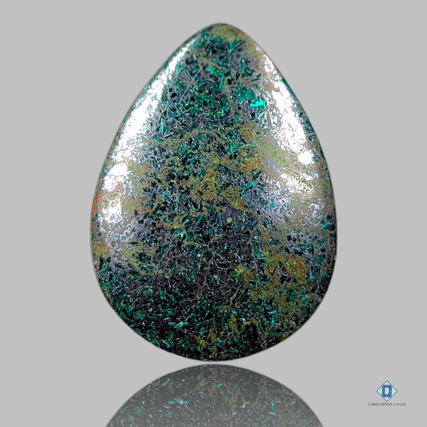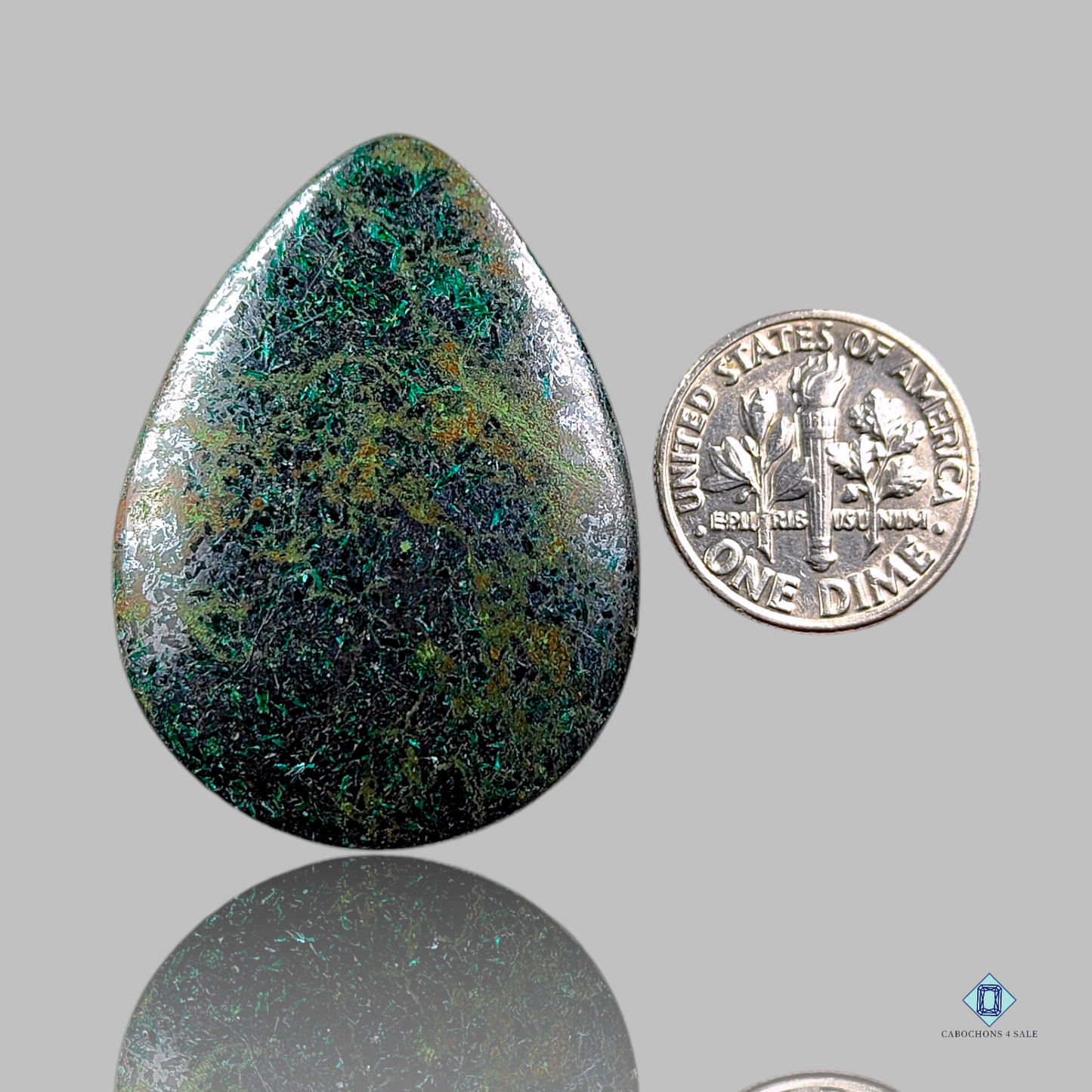 This is a Dioptase stone. The product is a natural pear shape opaque. Dioptase in green color with the approx size of 35-40mm. Clarity of This Piece is opaque. The Product is sold as pictured: 1pc pear cabochons for the Price Listed.