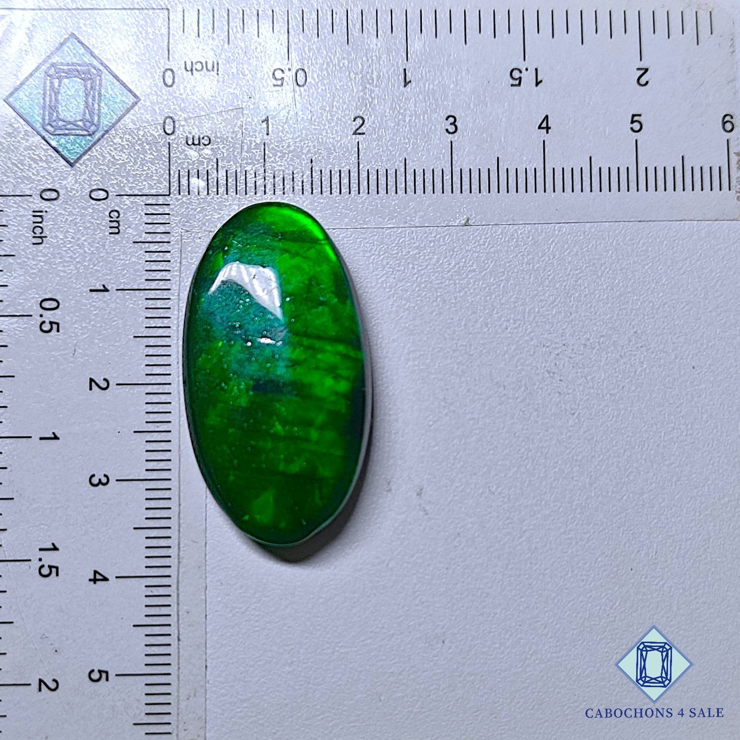 Swipe images to see stone with Dimension chart. This is a Dyed Green Labradorite gemstone. The Product is a natural , Oval, Translucent. Dyed Green Labradorite gemstone in Green color with the size of 35*19*7mm. Clarity of this Dyed Green Labradorite Piece is Translucent. The Product is available exactly same shown in the picture: 1 piece Oval Cabochons Dyed Green Labradorite certified for the price listed above.