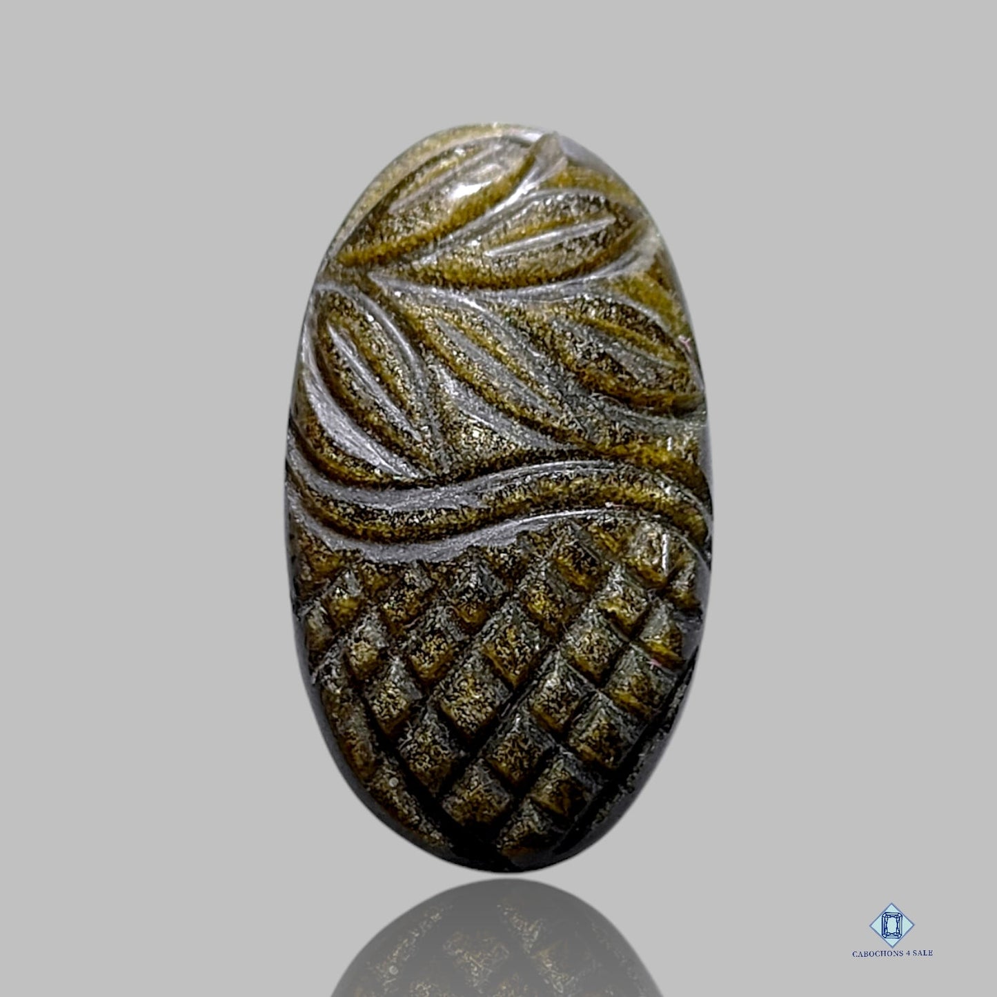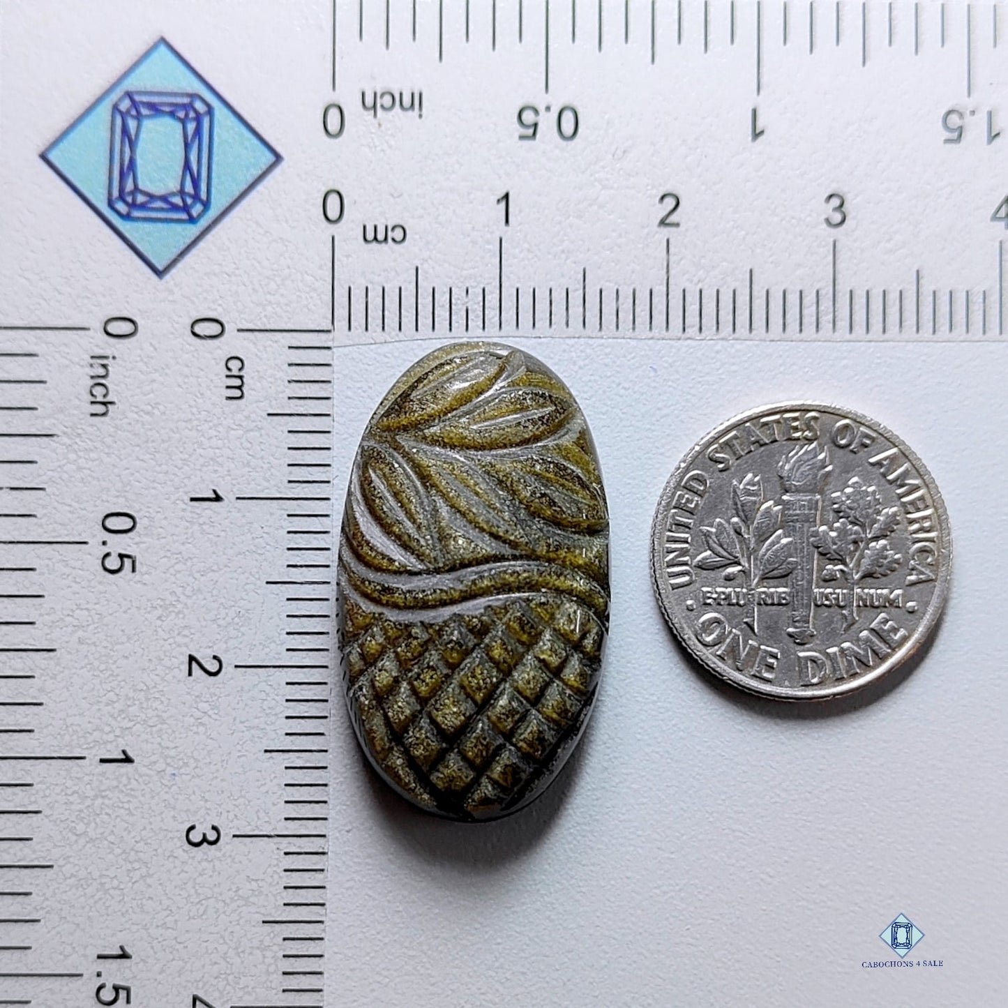Swipe images to see stone with Dimension chart. This Is a Golden Obsidian. The Product is a natural Oval Opaque.Golden Obsidian in Gray colour with the approx size of 25 to 30mm. Clarity of This Golden Obsidian Piece is Opaque. The Product is sold as pictured 1pc Oval Carvings Golden Obsidian for the price Listed.