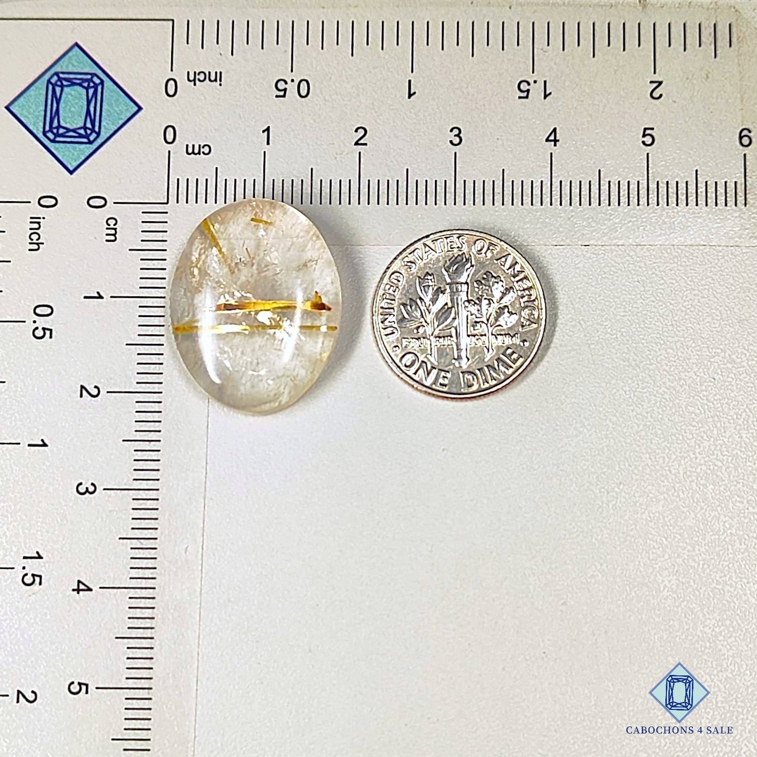 Swipe images to see stone with Dimension chart. This is a Golden Rutile Quartz gemstone. The Product is a natural , Oval, Transparent. Golden Rutile Quartz gemstone in Colorless color with the size of 22*17*6mm. Clarity of this Golden Rutile Quartz Piece is Transparent. The Product is available exactly same shown in the picture: 1 piece Oval Cabochons Golden Rutile Quartz certified for the price listed above.