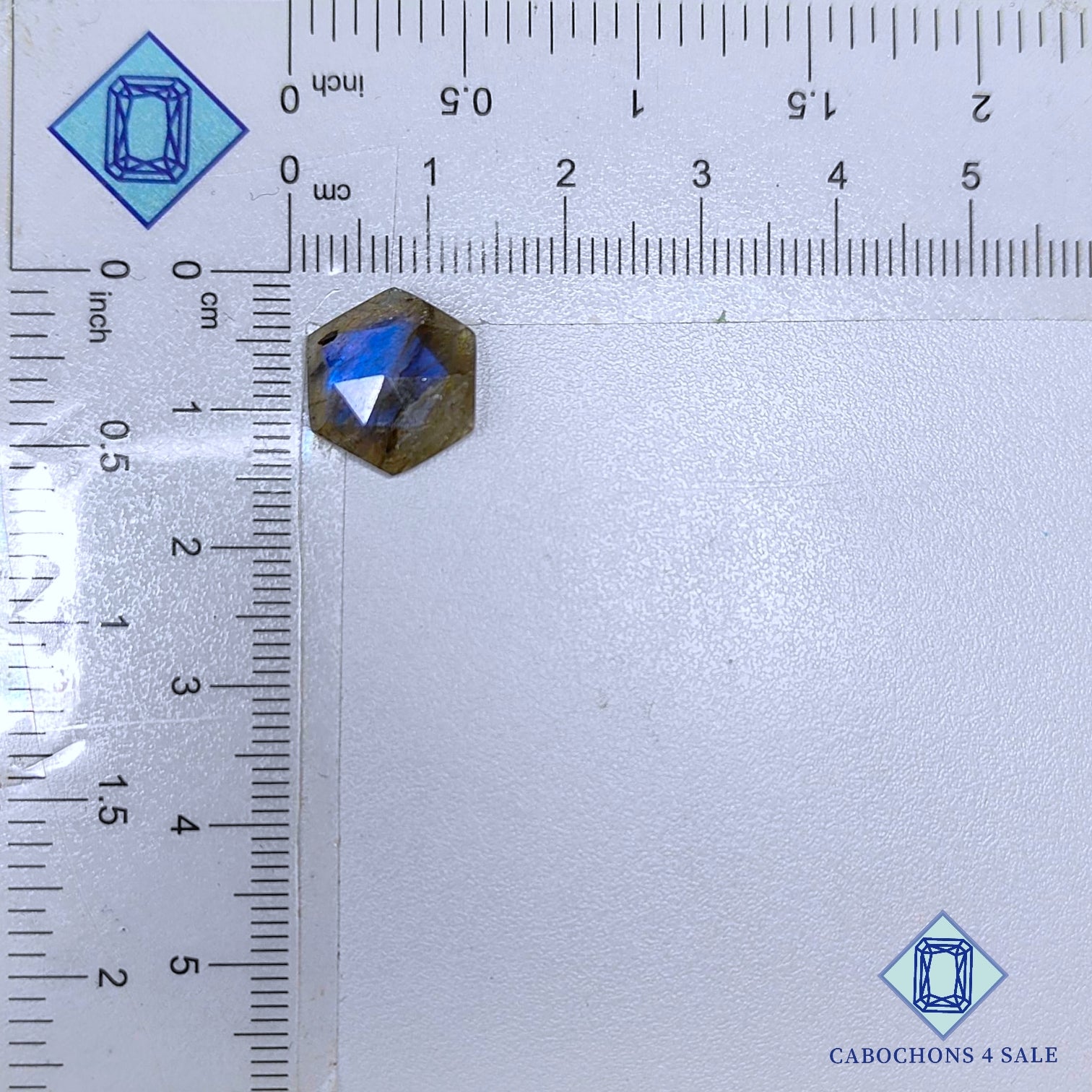 Swipe images to see stone with Dimension chart. This is a Labradorite gemstone. The Product is a natural , Hexagon, Translucent. Labradorite gemstone in Blue color with the  size of 13*12*5mm. Clarity of this Labradorite Piece is  Translucent. The Product is available exactly same shown in the picture: 1 piece Hexagon Rose Cut Labradorite certified for the price listed above.