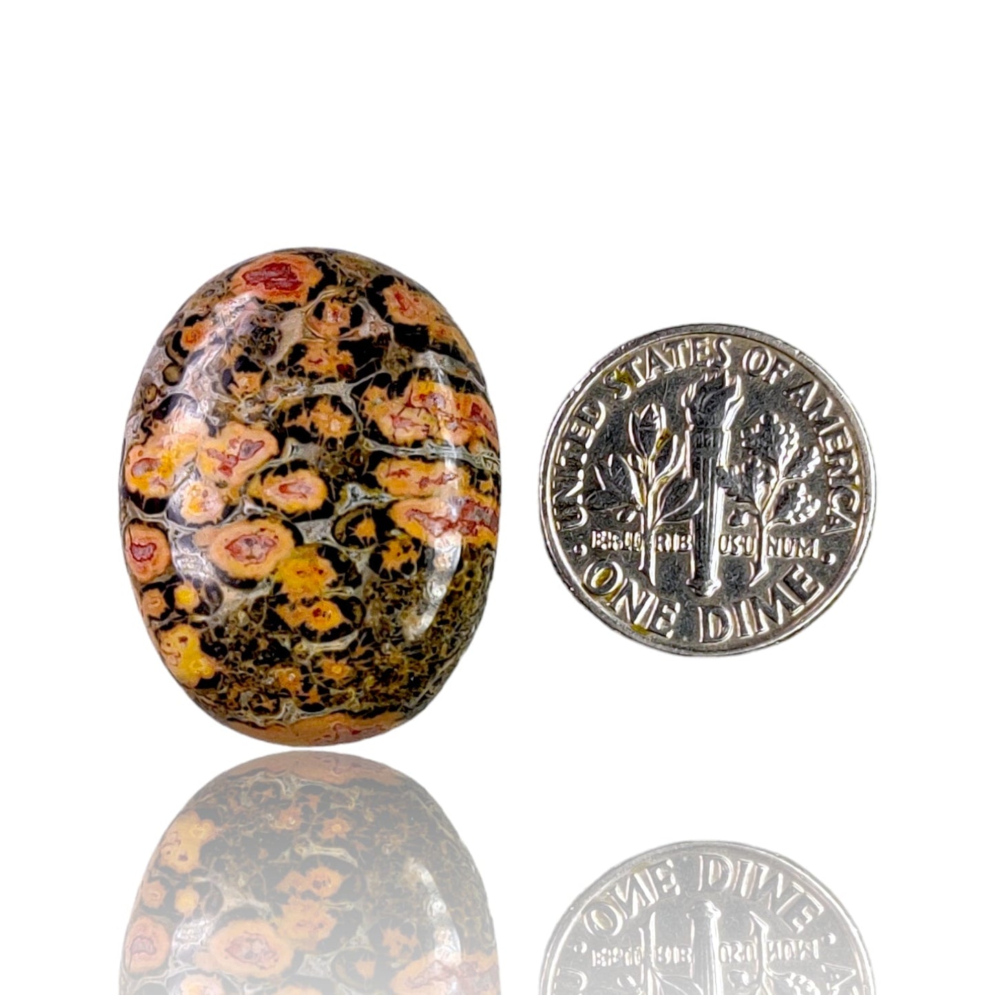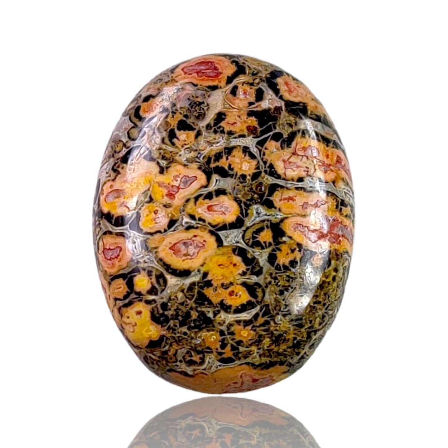 This is a Leopard Skin Jasper. The product is a natural oval Leopard Skin Jasper in yellow color with the approximate size of 26 x 20 x 6 mm. Clarity of this piece is opaque. The product is sold as pictured: 1pc oval cabochon for the price listed.