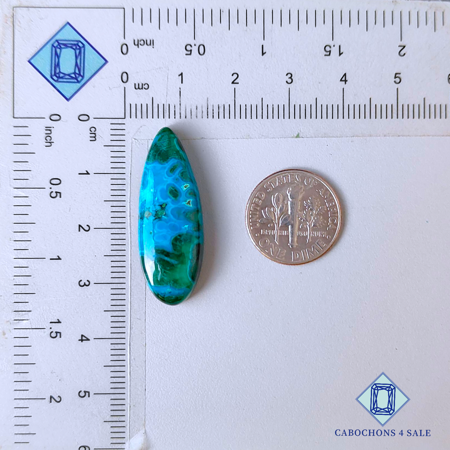 Swipe images to see stone with Dimension chart. This is a Malachite Chrysocolla gemstone. The Product is a natural , Oval, Opaque. Malachite Chrysocolla gemstone in Green color with the size of 32*12*6mm. Clarity of this Malachite Chrysocolla Piece is Opaque. The Product is available exactly same shown in the picture: 1 piece Oval Cabochons Malachite Chrysocolla certified for the price listed above.