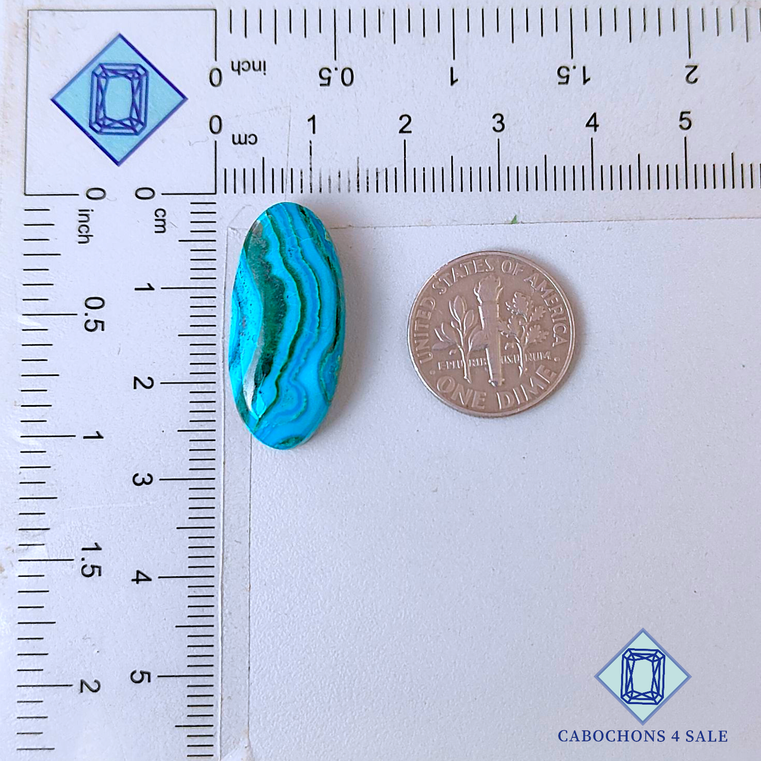 Swipe images to see stone with Dimension chart. This is a Malachite Chrysocolla gemstone. The Product is a natural, Oval, Opaque. Malachite Chrysocolla gemstone in Blue color with the size of 25*12*6mm. Clarity of this Malachite Chrysocolla Piece is Opaque. The Product is available exactly same shown in the picture: 1 piece Oval Cabochons Malachite Chrysocolla certified for the price listed above.