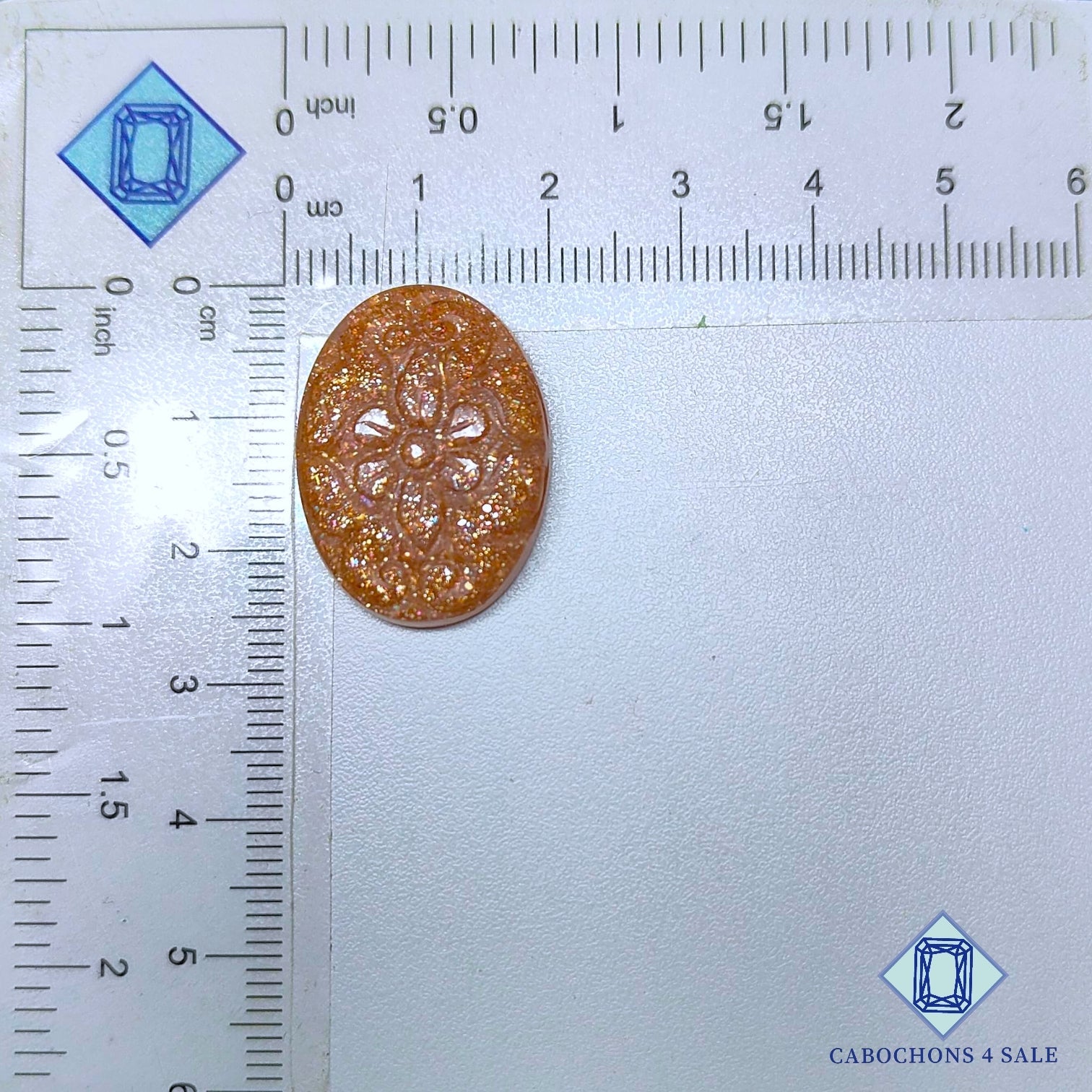 Swipe images to see stone with Dimension chart. This is a Peach Moonstone gemstone. The Product is a natural , Oval, Translucent. Peach Moonstone gemstone in Brown color with the size of 25*18*5mm. Clarity of this Peach Moonstone Piece is Translucent. The Product is available exactly same shown in the picture: 1 piece Oval Carvings Peach Moonstone certified for the price listed above.
