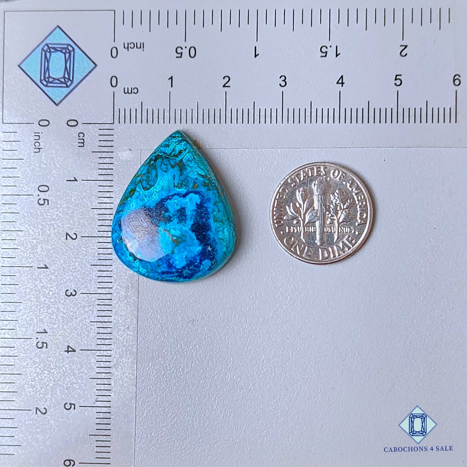 Swipe images to see stone with Dimension chart. This is a Shattuckite gemstone. The Product is a natural , Pear, Opaque. Shattuckite gemstone in Blue color with the size of 27*22*7mm. Clarity of this Shattuckite Piece is Opaque. The Product is available exactly same shown in the picture: 1 piece Pear Cabochons Shattuckite certified for the price listed above.