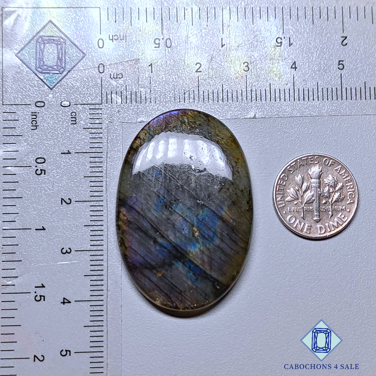 Swipe images to see stone with Dimension chart. This is a Spectrolite gemstone. The Product is a natural, Oval, Translucent. Spectrolite gemstone in Purple color with the size of 41*28*4mm. Clarity of this Spectrolite Piece is Translucent. The Product is available exactly same shown in the picture: 1 piece Oval Cabochons Spectrolite certified for the price listed above.